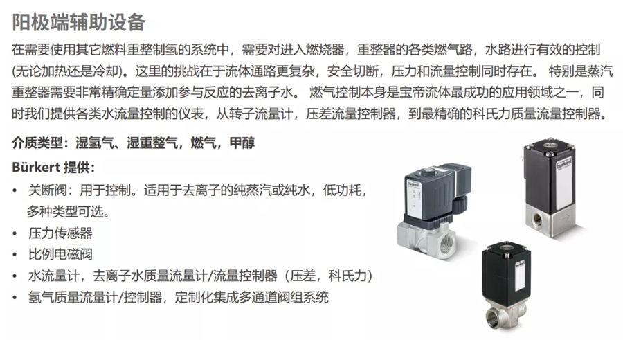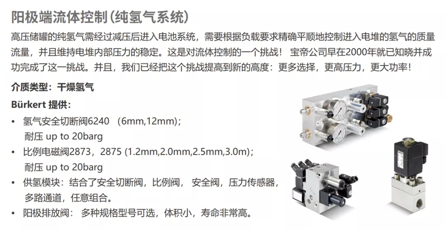 提供有關電池堆棧方面的全面支持,該技術方案采用Bürkert比例電磁閥、質量流量計、溫度和壓力傳感器等產品配置成氫燃料供應裝置,體積小、重量輕,結構緊湊,可使燃料電池在最佳條件下運行。