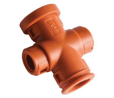 Two-piece X configuration fitting. These fittings are designed to snap together over all types of slit and unslit Harnessflex conduit, maintaining maximum conduit bore. Full TempGuard system protection is achieved using these fittings with HTC conduit.