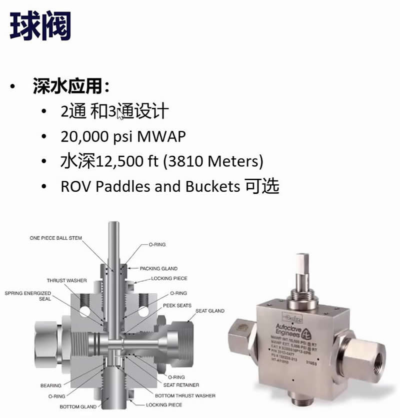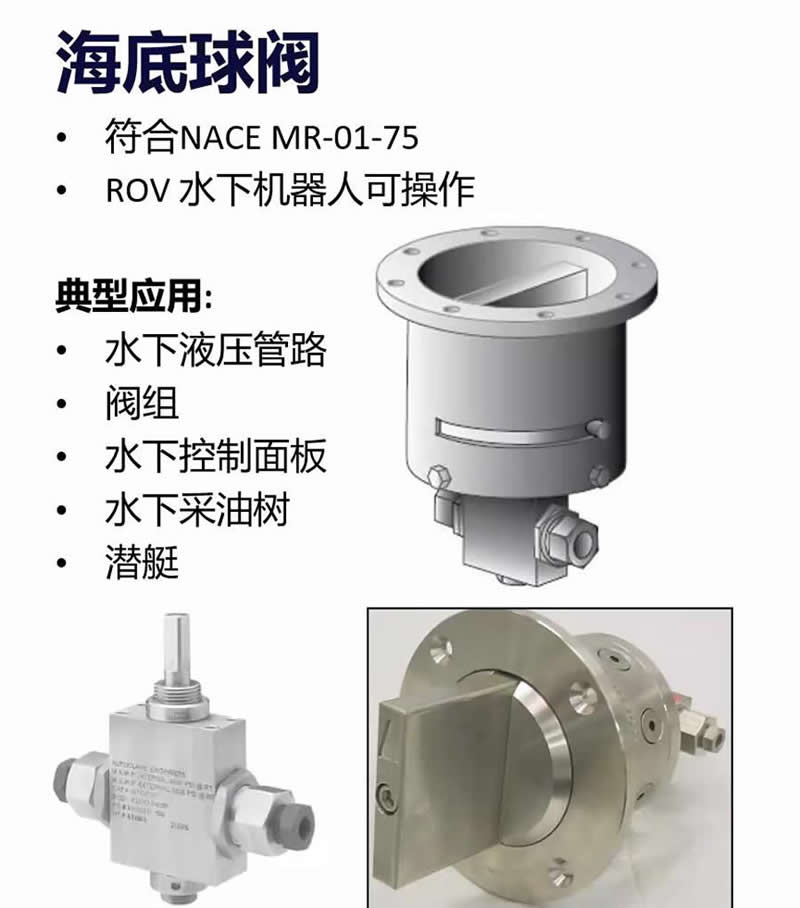 - 海底球閥深水應用:2通和3通設計,壓力可達20000psi, 水深達3810米,12500ft; ROV Paddles and buckets可選。海底球閥符合NACE MR-01-75標準,ROV水下機器人可操作。海底球閥典型應用包括水下液壓管路、閥組、水下控制面板、水下采油樹和潛艇。