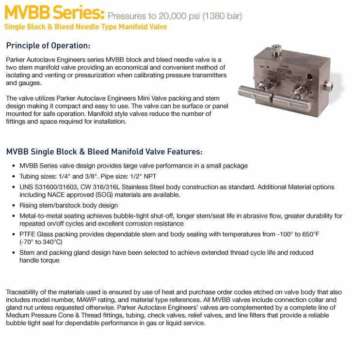 Needle Valve,Mini Block and Bleed MVBB Series - 20,000 PSI Parker Autoclave MVBB系列微型切斷和放氣針形閥是一種兩桿式歧管閥,提供了一種經濟方便的切斷、放氣和校準壓力變送器和壓力表的方法。該閥門采用微型閥門填料和閥桿設計,使其緊湊且易于使用。為了安全操作,閥門可以安裝在表面或面板上。此外,歧管式閥門減少了安裝所需的配件數量和空間。Parker Autoclave's MVBB Series mini block and bleed needle valves are a two stem manifold valve providing an economical and convenient method of blocking, bleeding and calibrating pressure transmitters and gauges. The valve utilizes the mini valve packing and stem design making it compact and easy to use. The valve can be surface or panel mounted for safe operation. In addition, manifold style valves reduce the number of fittings and space required for installation. 這些閥門有一個上升閥桿桿體設計,工作壓力為20000磅/平方英寸(1379巴)。錐管和螺紋連接采用Parker Autoclave管,尺寸從1/4“到3/8”。使用特殊的石墨編織紗填料(GY),工作溫度可以從0°F到800°F(-17.8°C到427°C)。316不銹鋼結構是標準材料,有其他選擇。這些閥門具有許多特點,可在各種應用中提供可靠和無故障的服務。These valves have a rising stem bar stock body design with working pressures to 20,000 psi (1379 bar). The cone and thread connections utilize Parker Autoclave tubing with sizes from 1/4" to 3/8”". Operating temperatures can go from 0°F to 800°F (-17.8°C to 427°C) with special graphite braided yarn packing (GY). 316 stainless steel construction is the standard material with other options available. Along with their many features these valves provide dependable and trouble free service in wide variety of applications.