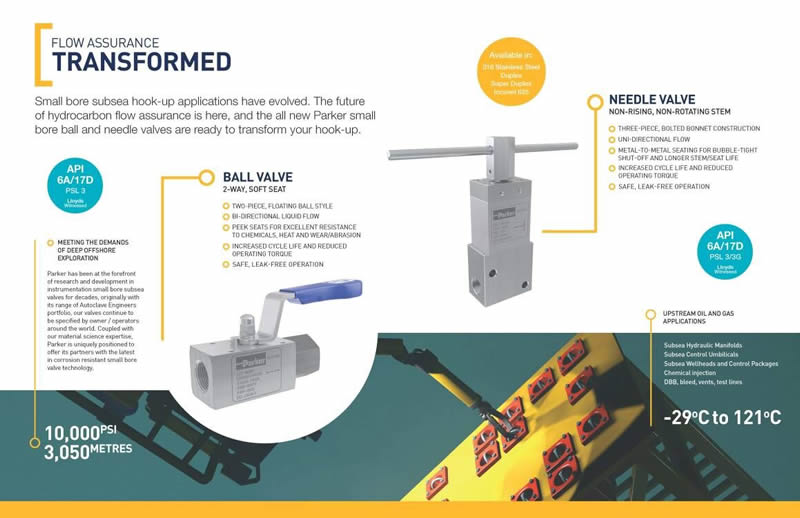 Barnstaple, UK. 28. May 2020 – Parker Hannifin, the global leader in motion and control technologies, has launched a new range of small-bore subsea ball valves and subsea needle valves for leak-free and reliable, long-term performance in subsea applications up to 10,000 PSI (689 bar) and depths down to 3,050 m (10,000 ft).