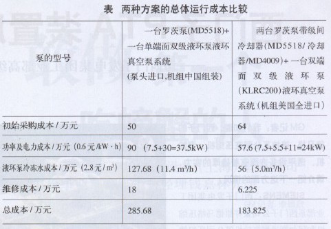 一臺(tái)單端面雙級(jí)液環(huán)泵的技術(shù)計(jì)劃的總體運(yùn)轉(zhuǎn)本錢(qián)與兩臺(tái)羅茨泵帶級(jí)間冷卻器(MD5518/冷卻器/MD4009)+