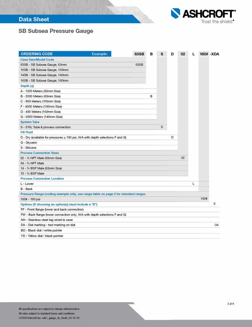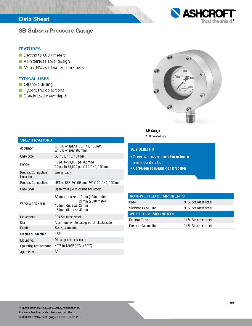 Datasheet SB Subsea Pressure Gauge - ashcroft