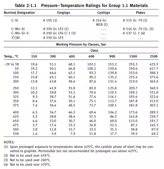 下表選取ASMEB16.5-2009標準中1.1材質組的壓力-溫度額定值表。表格中列出了1.1材質組包含的幾種材質,列出了溫度范圍以及壓力等級對應的在不同溫度下的工作壓力。使用該表格需注意以下幾點: