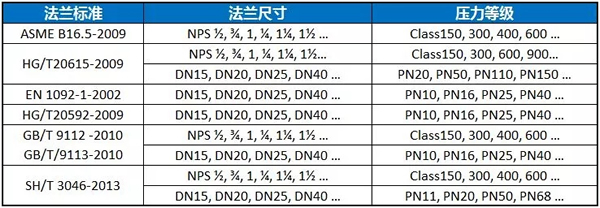 NPS/Class和DN/PN兩種表達(dá)方式都有。其中,DN/PN與EN1092 -2002和HB/T20592-2009標(biāo)準(zhǔn)中相同規(guī)格法蘭尺寸基本相同; NPS/Class與ASME B16.5標(biāo)準(zhǔn)中相同規(guī)格法蘭尺寸基本相同,但螺栓是公制的。