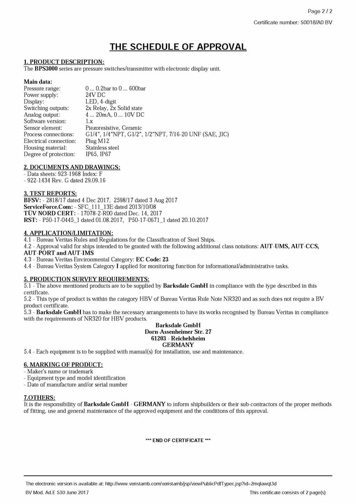 BPS3000系列電子壓力開關產品獲得BV船級社認證
