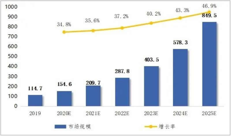 近年來,隨著英特爾、華為、浪潮、聯想、阿里等企業在液冷領域不斷探索,正加速推動液冷數據中心基礎設施商業化的進程。科智咨詢預計,到2025年,中國液冷數據中心應用市場規模將從2019年的114.7億元達到849.5億元。