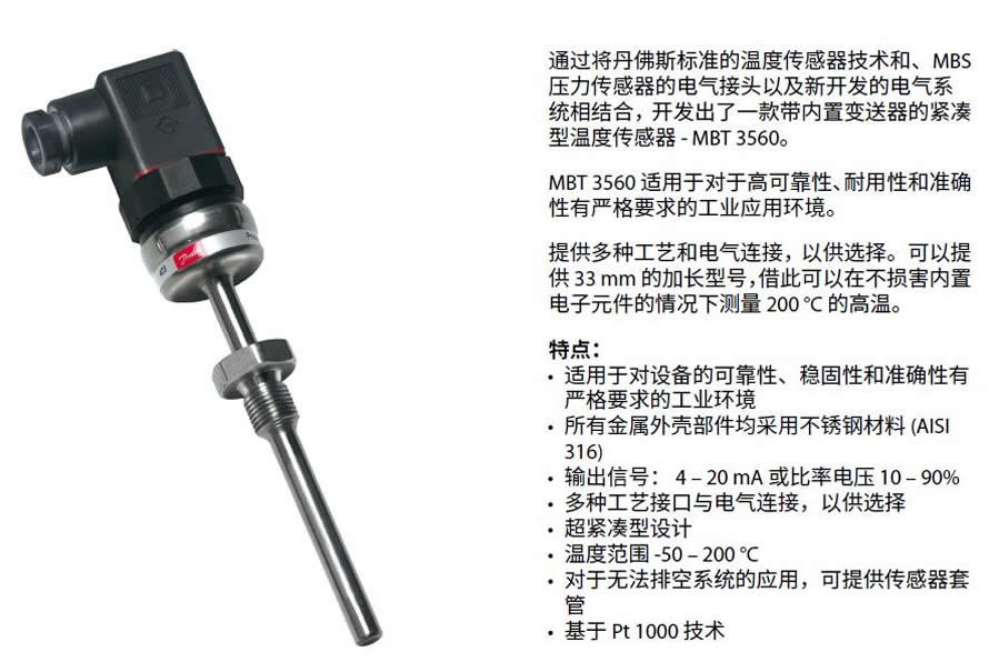 通過采用 MBT3560,我們可將標準溫度傳感器技術和我們 MBS 壓力傳感器的電氣連接與新開發的電子設備相結合,從而形成了一款帶內置變送器的緊湊型溫度傳感器。