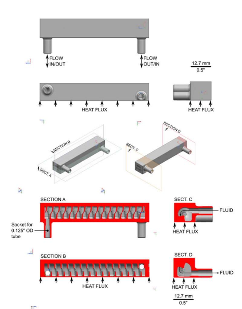 2021年,GE 公司開發了封裝集成旋流冷卻器(PICCO)的原型。研究人員在渦流傳熱的熱流控模型指導下,通過增材制造在冷卻器壁面上構建有序排列的三角形鰭片,以形成漩渦流體而去除冷卻器壁面上的氣泡,并將其限制在冷卻器的中心部位,然后通過軸向流將氣泡輸送走。研究人員認為,這種技術消除了兩相流體冷卻的風險。經量化測試,PICCO 將傳熱系數提高了一倍,而壓降只增加 13%。