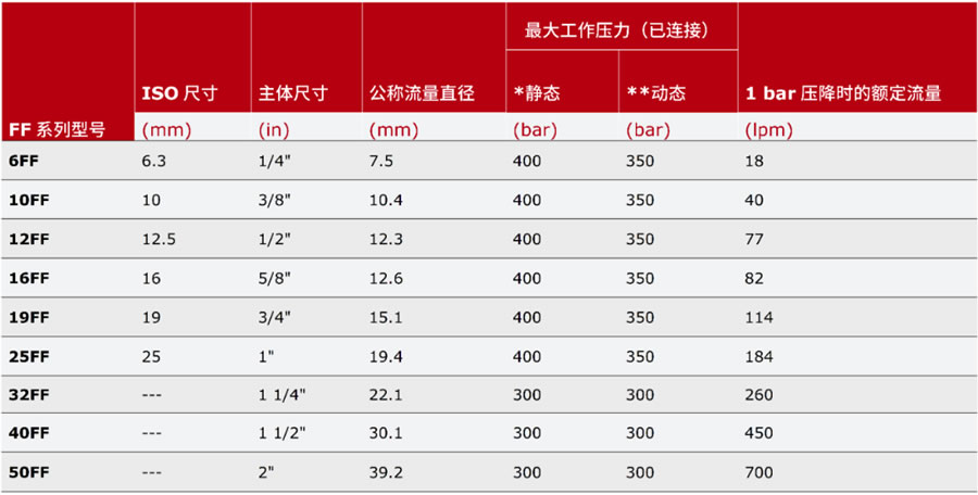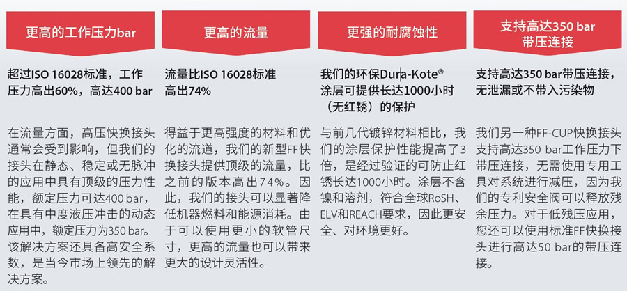 FF系列快換接頭的優勢 - 更高的工作壓力bar:超過ISO 16028標準,工作壓力高出60%,高達400bar。