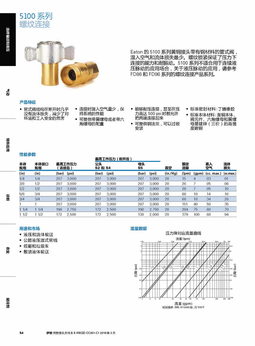 AEROQUIP 5100 系列液壓快速連接接頭螺紋連接,以防止公端旋轉。將兩半一起擰緊,同時盡量減少進入管路的空氣或流體損失。接頭旨在與接受多種類型接頭的通用互換配合使用。5100 系列接頭連接到液壓和流體輸送、散裝液體輸送或傾倒和垃圾車輛中的軟管。伊頓的 5100 系列黃銅接頭與鋼管閥提供最小的空氣夾雜物和流體損失。螺紋鎖扣提供壓力連接能力和抗振性。5100 系列不適用于連續液壓脈沖應用。對于液壓脈沖應用,請參考 FD86 和 FD96 系列螺紋連接產品線。AEROQUIP 5100 Series hydraulic quick-connect couplings thread-to-connect to prevent male end from rotating. Tighten halves together with minimal air entering line or fluid loss. Couplings are designed to work with universal interchanges accepting multiple styles of nipples. 5100 Series couplings connect to hoses in hydraulics and fluid transfer, bulk liquid transfer, or dump and refuse vehicles.