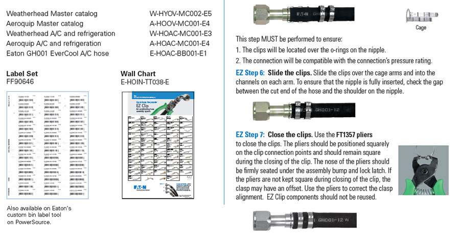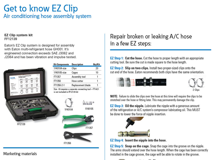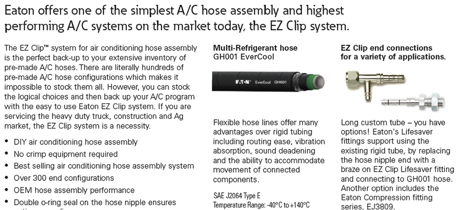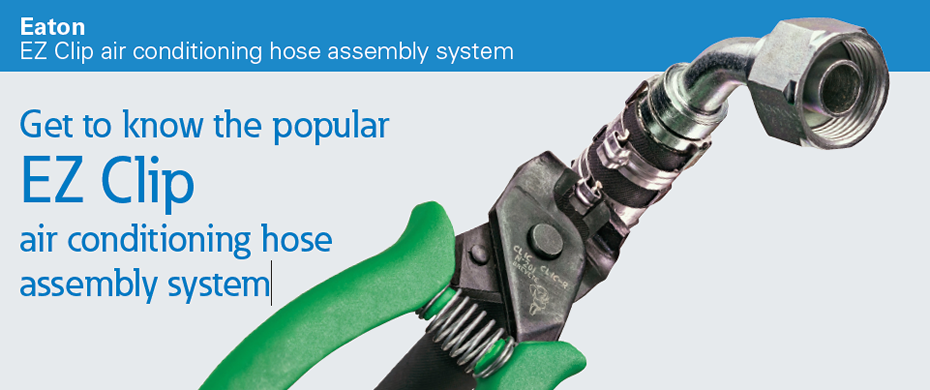 The EZ Clip- system for air conditioning hose assembly is the perfect back-up to your extensive inventory of pre-made A/C hoses- There are literally hundreds of pre-made A/C hose configurations which makes it impossible to stock them all- However, you can stock the logical choices and then back up your A/C program with the easy to use Eaton EZ Clip system- If you are servicing the heavy duty truck, construction and Ag market, the EZ Clip system is a necessity.