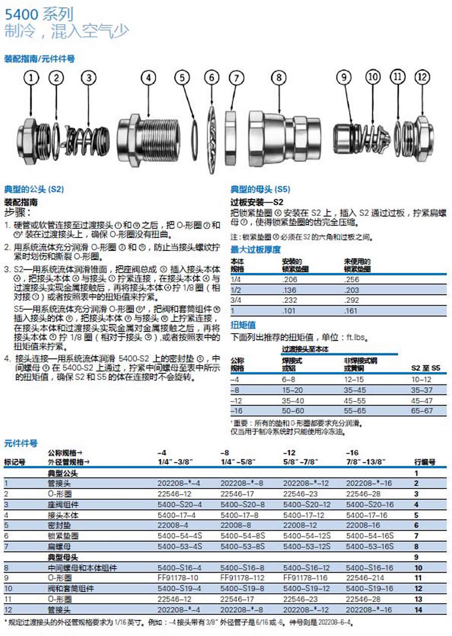 在 5400-S2 上通過,擰緊中間螺母至表中所示規格或鋁或黃銅 S2 至 S5 的扭矩值,確保 S2 和 S5 的體在連接時不會旋轉。–4 6–8 12–15 10–12