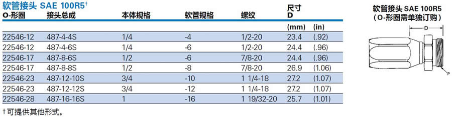 軟管接頭 SAE 100R5.尺寸 軟管接頭 SAE 100R5 O-形圈接頭總成本體規格軟管規格螺紋 D (O-形圈需單獨訂購)