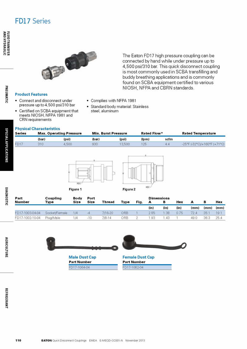 Eaton FD17系列高壓快速接頭設計用于適于吸入的空氣transfilling的應用。使用在SCBA設備證明了到NIOSH、NFPA和CBRN標準。該系列的前身為 Aeroquip FD17 品牌,是一種高壓接頭,可在高達 4,500 psi/310 bar 的壓力下手動連接。特點包括在高達 4,500 psi/310 bar 的壓力下連接和斷開;通過符合 NIOSH、NFPA 1981 和 CRN 要求的 SCBA 設備認證 符合 NFPA 1981。FD17高壓接頭應用包括:SCBA 換氣和伙伴呼吸應用等。 Eaton FD17 high pressure coupling can be connected by hand while under pressure up to 4,500 psi/310 bar. This quick disconnect coupling is most commonly used in SCBA transfilling and buddy breathing applications and is commonly found on SCBA equipment certified to various NIOSH, NFPA and CBRN standards.