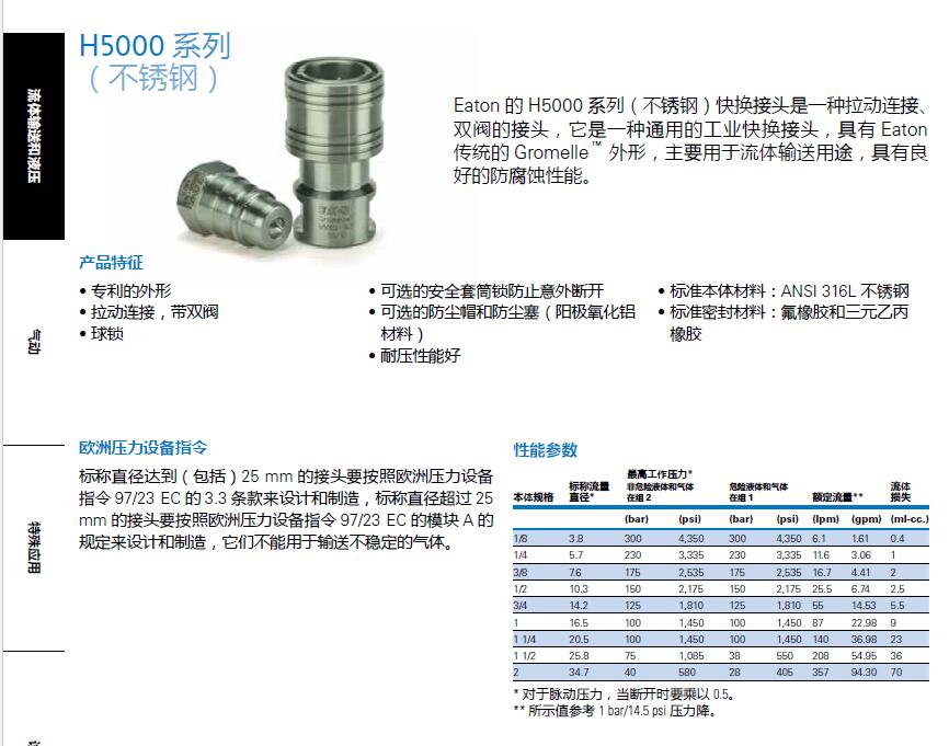 Eaton的 H5000系列(不銹鋼)快換接頭是一種拉動(dòng)連接、雙閥的接頭,它是一種通用的工業(yè)快換接頭,具有 Eaton傳統(tǒng)的 Gromelle .外形,主要用于流體輸送用途,具有良好的防腐蝕性能。 Eaton H5000 Series stainless steel quick disconnect coupling is a pull to connect double shut-off coupling. It is a general purpose industrial coupling with the original Eaton’s Gromelle? profile. It is mainly used in fluid transfer applications and provides excellent corrosion resistance.