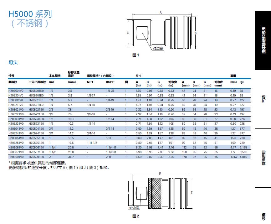 氟橡膠三元乙丙橡膠(in) (mm) NPT BSPP 圖A B C 對(duì)邊寬A B C 對(duì)邊寬(lbs) (g)
