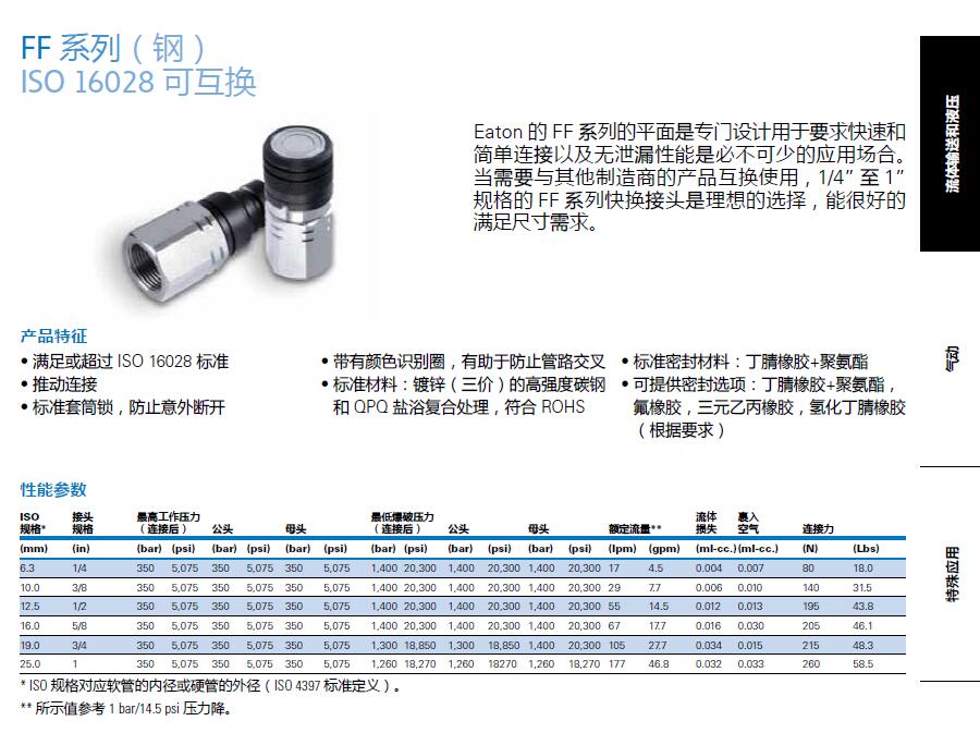 - FF 系列碳鋼材質 ISO 16028標準可互換快速接頭