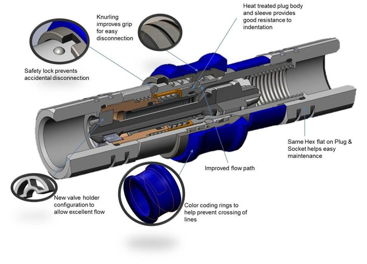 -Automatic flow on connection, automatic shut-off of both halves on disconnection