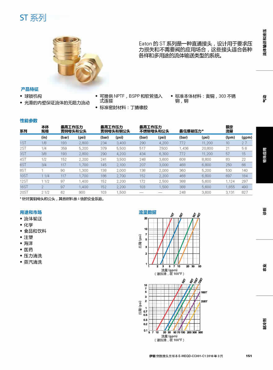 EATON Hansen ST系列是一種無閥門快速接頭,用于需要最大流量及最少壓降的領域。EATON Hansen ST系列直通式快速接頭應用:ST系列提供的大流量被用于壓力清洗裝置、蒸汽清洗、液體運輸、模具冷卻線路及化工。Eaton ST系列是一種直通接頭,設計用于要求壓力損失和不需要閥的應用場合,這些接頭適合各種各樣和多用途的流體輸送類型的系統。