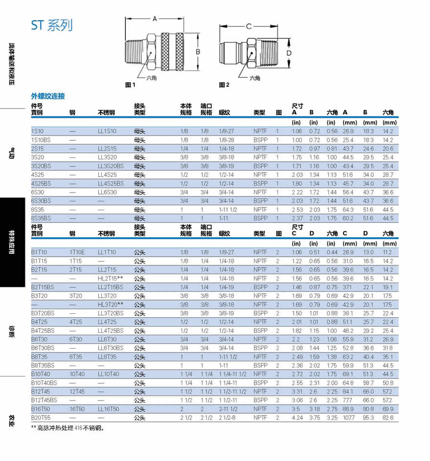 - 主體尺寸1/4''和3/8''的接頭可選高強度熱處理416不銹鋼公頭