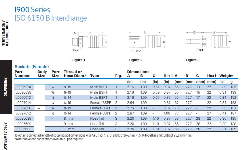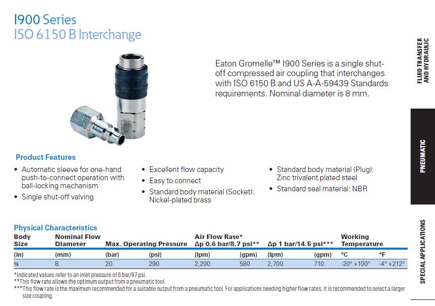 伊頓 Gromelle I900 系列是單關斷壓縮空氣接頭,可與 ISO 6150 B 和美國 A-A-59439 標準要求互換。 標稱直徑為 8 毫米。Eaton Gromelle I900 Series is a single shut-off compressed air coupling that interchanges with ISO 6150 B and US A-A-59439 Standards requirements- Nominal diameter is 8 mm.