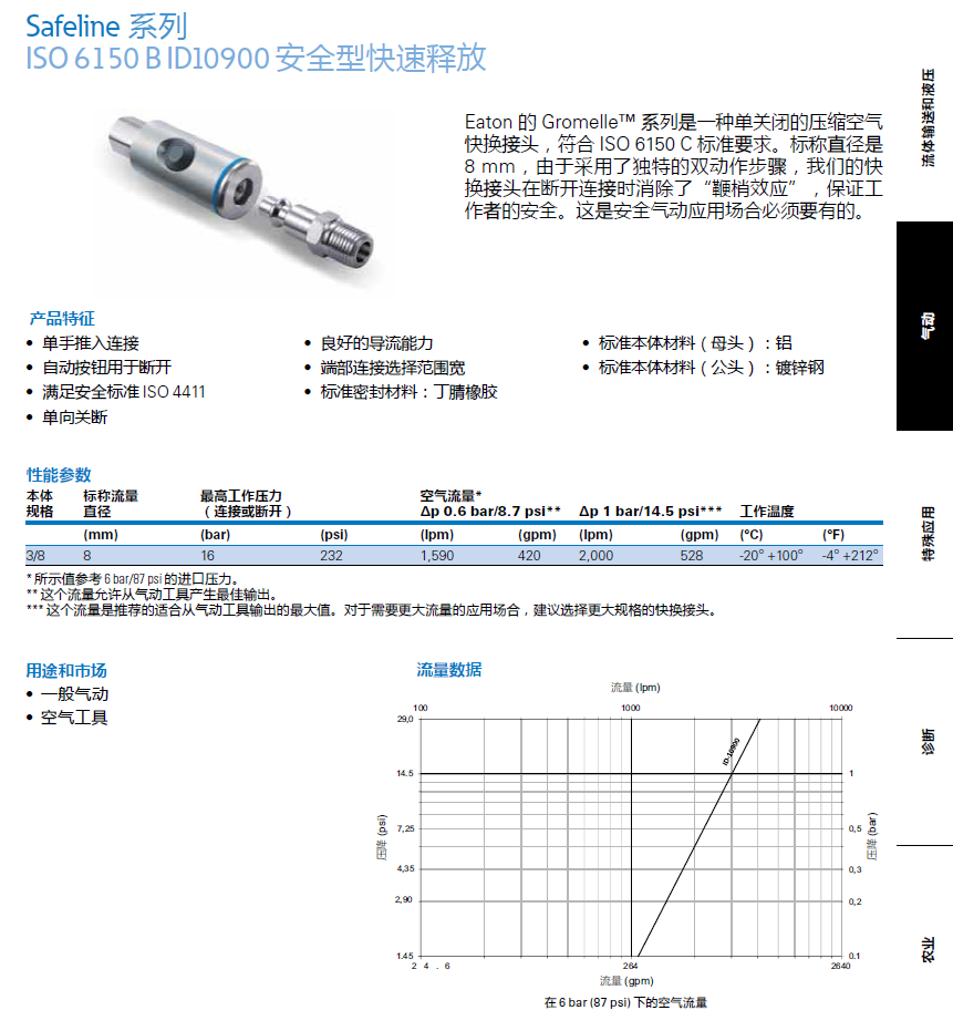 這個流量是推薦的適合從氣動工具輸出的最大值。對于需要更大流量的應用場合,建議選擇更大規(guī)格的快換接頭。