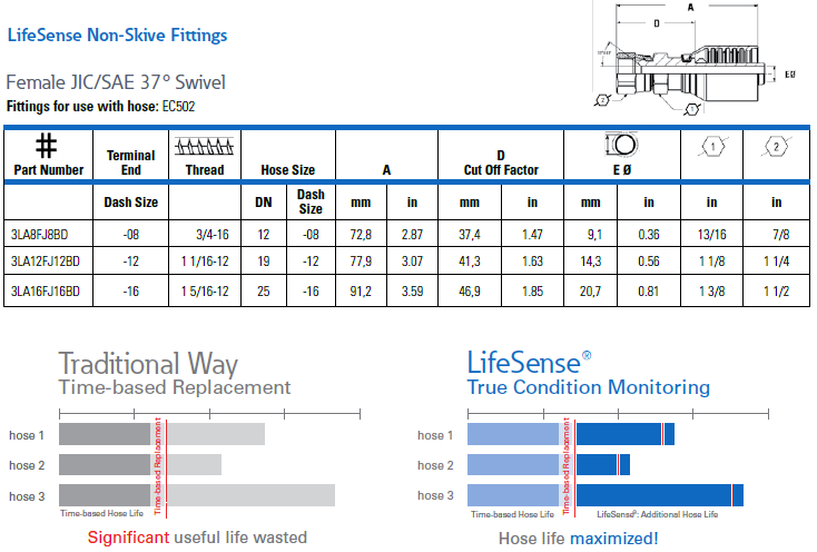 和傳統定期更換方式相比較,LifeSense的失效通知給維護人員預留了足夠的時間來進行總成更換,同時大程度上減少了浪費現象。ifesense軟管大幅提高設備可靠性,在液壓軟管將要失效時發出報警信號,更大化機器正常運行時間,保護設備和人員安全,并延長軟管使用壽命達50%,在需要更換液壓軟管時才進行更換,還保護環境,減少潛在環境污染可能性。