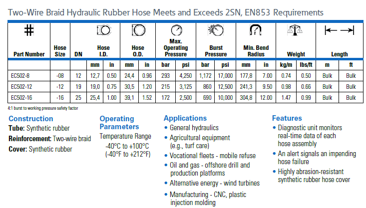 EATON Lifesense智能軟管通過即時監控管路的使用狀況,當軟管總成接近使用壽命的時候,LifeSense能探測到軟管總成內部可能導致泄漏的變化,并通知相關人員軟管總成需要更換。