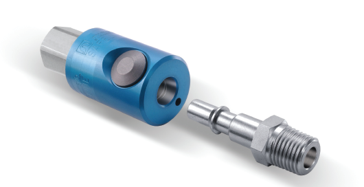 pneumatic coupling with push button safety feature designed for use with compressed air. Two-step disconnect procedure shuts off air supply and releases downstream air pressure before plug can be removed from socket/female, which prevents