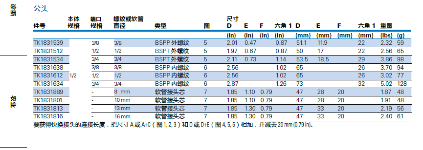 本體端口螺紋或軟管尺寸件號規格規格直徑類型圖 D EF六角 1D E F六角 1重量