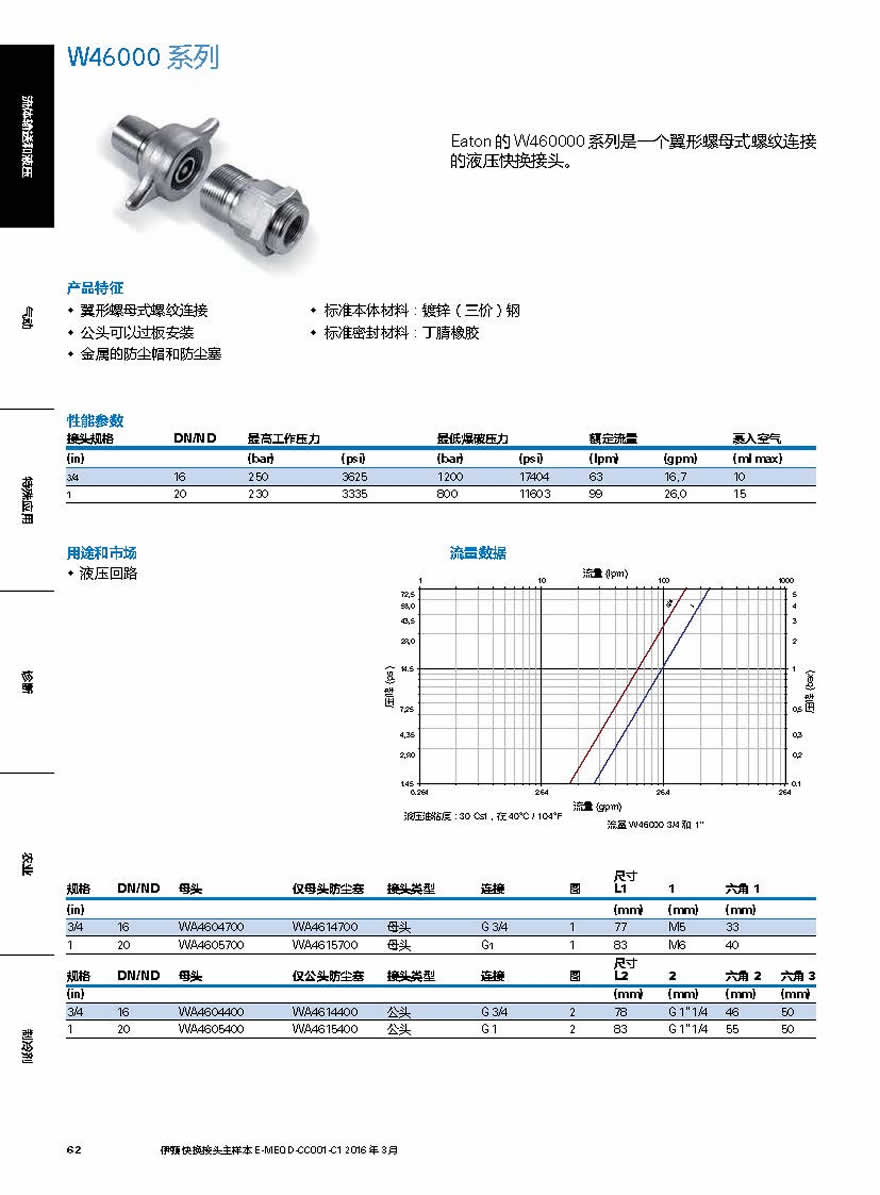 Eaton 的 W460000 系列是一個翼形螺母式螺紋連接的液壓快換接頭。Eaton's W46000 Series is a wing nut style screw to connect coupling used in hydraulic applications.