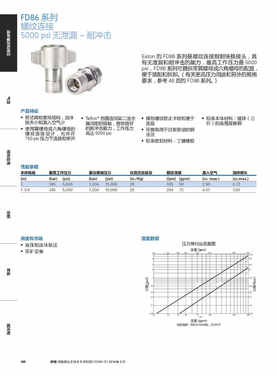 Eaton的 FD86系列是螺紋連接鋼制快換接頭,具有無泄漏和耐沖擊的能力,最高工作壓力是 5000 psi,FD86系列可提供帶翼螺母或六角螺母的配置,便于裝配和拆卸。(有關更高壓力用途和另外的規格要求,參考 48頁的 FD96系列。)Eaton’s FD86 Series is a thread together steel quick coupling offering dry break and high impulse technology and capabilities. The maximum operating pressure is 5,000 psi. The FD86 Series is available in either wing nut or hex nut configurations for ease of assembly and disassembly. (For higher pressure applications and additional size requirements, refer to FD96 on page 44.)