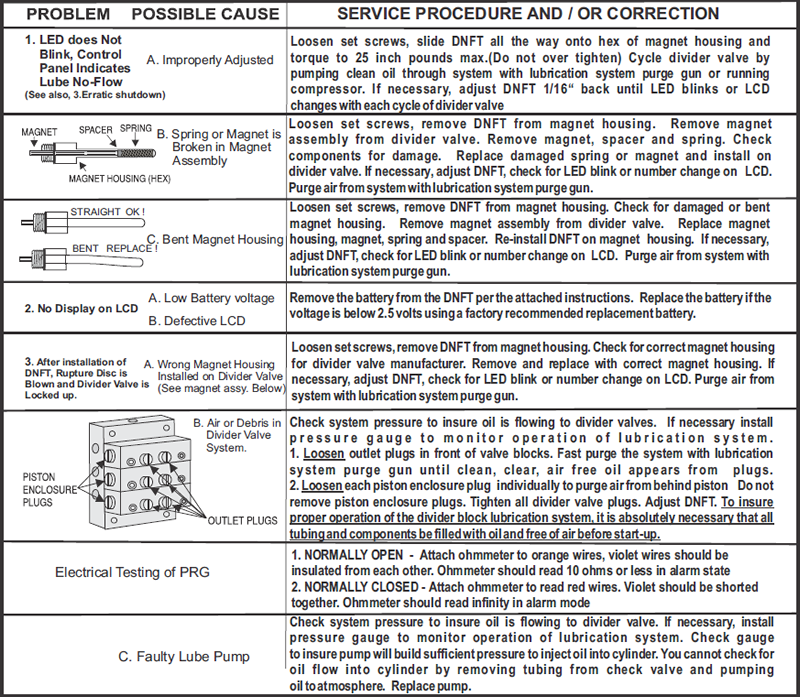 Lubricant flow through the divider valve assembly forces the pistons to cycle back and forth causing a lateral movement of a magnet linked to the piston. Movement is monitored by the microprocessor which resets the timer, lights the LED, and allows the unit to continue operation. This indicates one complete cycle of the lubrication system. The microprocessor must receive this cycle in a predetermined time or a shutdown will occur. The DNFT will automatically reset alarm circuit when normal operation of divider valve resumes.