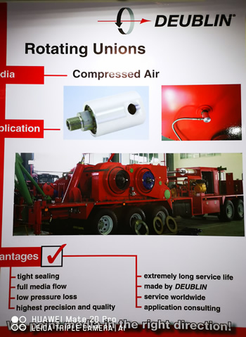 DEUBLIN公司攜新產(chǎn)品亮相展會(huì),包括:石油頂驅(qū)配套旋轉(zhuǎn)接頭;連續(xù)油管車(chē)配套多通道旋轉(zhuǎn)接頭;石油壓裂泵和泥漿泵配套旋轉(zhuǎn)接頭;動(dòng)力水龍頭配套高壓旋轉(zhuǎn)接頭;用于車(chē)載石油鉆機(jī)鉆塔設(shè)備以及制動(dòng)和開(kāi)動(dòng)鉆井平臺(tái)的鼓形剎車(chē)系統(tǒng)的雙通道旋轉(zhuǎn)接頭。