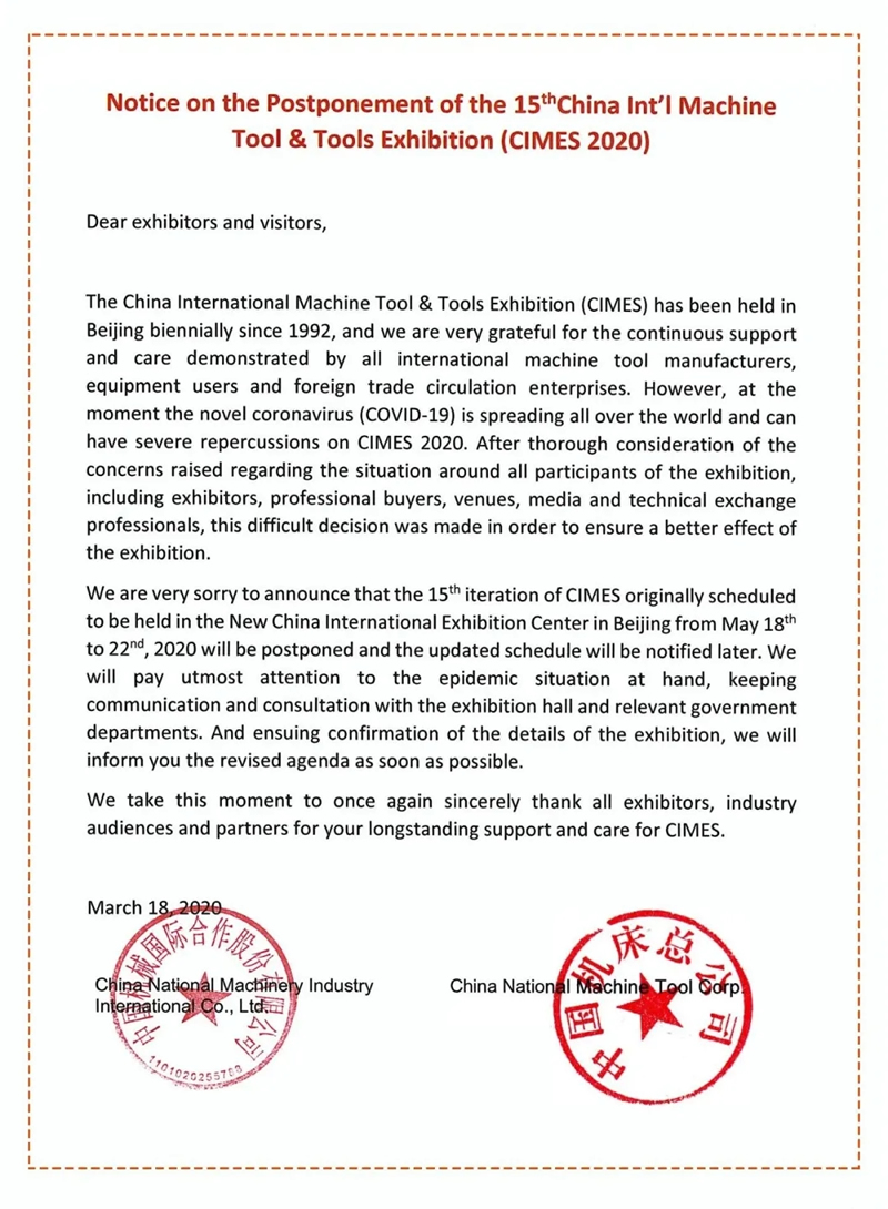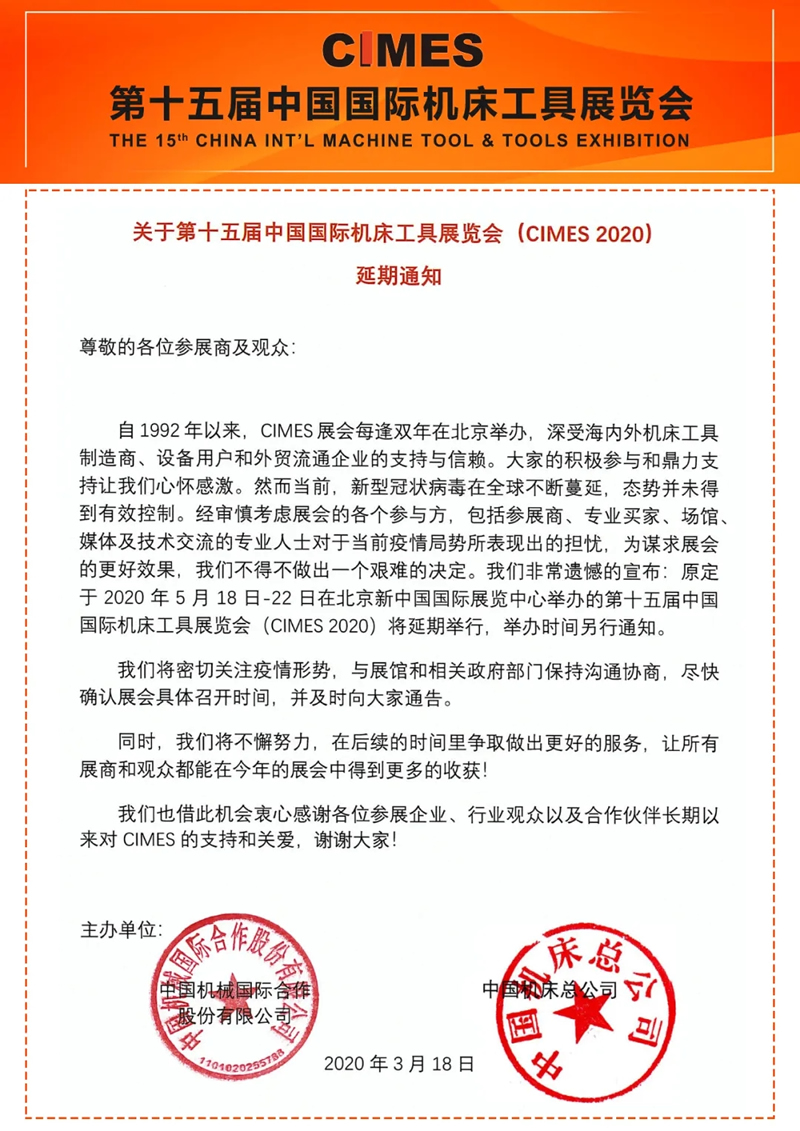 CIMES2020第十五屆中國國際機床工具展覽會將延期舉辦