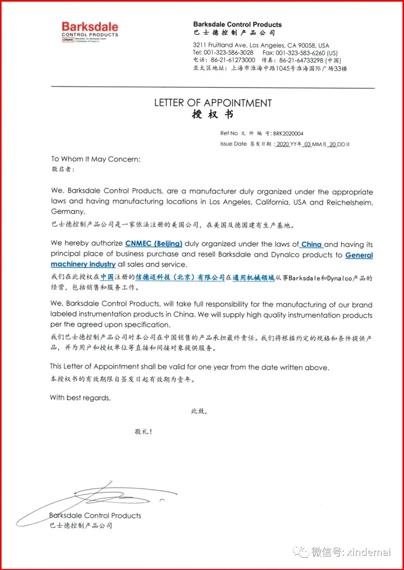 We hereby authorize CNMEC Beijing duly organized under the laws of China and having its principal place of business purchase and resell barksdale and Dynalco products to General machinery industry all sales and service.我們在此授權在中國注冊的信德邁科技(北京)有限公司在通用機械領域從事 Barksdale和Dynalco產品的經營,包括銷售和服務工作。