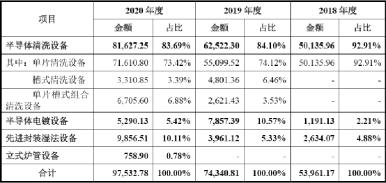 盛美半導體經過多年持續的研發投入和市場開拓,陸續開發了單片SAPS兆聲波清洗、單片TEBO兆聲波清洗、單片背面清洗、單片刷洗、自動槽式清洗以及單片槽式組合清洗等半導體清洗設備、立式爐管設備、用于半導體制造前道領域的電鍍銅設備和后道領域的電鍍設備以及無應力拋光設備、濕法刻蝕設備、涂膠設備、顯影設備和去膠設備等先進封裝濕法設備。