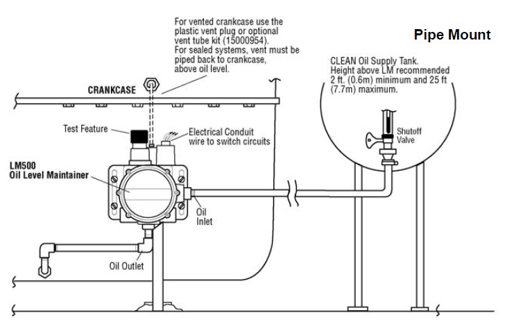 The LM500 maintains oil level on any size engine. As crankcase oil level drops, the LM500 float also drops and opens the Thumb-Valve. This allows oil to flow from the supply tank, through the LM500, and into the crankcase. When proper level is achieved in the crankcase, the LM500 float rises, causing the Thumb-Valve to close off further oil flow. The simple and unique Thumb-Valve is non-clogging and provides a positive, leak-free seal. It also supports installations that require a 3-wire, snap-action switch. The LM500 series maintains the crankcase oil level of an engine, pump or compressor. Adjusted to the correct running-oil-level, it will replenish oil as it is used. The low-level switch will alarm and/or shutdown the equipment if supply oil is lost and the equipment continues to use oil. The LM500 is made of die cast aluminum and features a clear "frog eye" high impact lens which allows the operator to view the oil level and condition without shutting down the equipment.