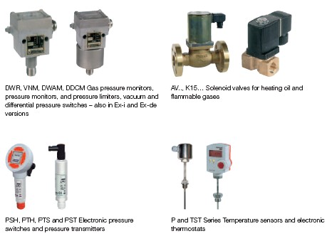 DWR, VNM, DWAM, DDCM Gas pressure monitors, AV.., K15… Solenoid valves for heating oil and pressure monitors, and pressure limiters, vacuum and .ammable gases differential pressure switches – also in Ex-i and Ex-de versions