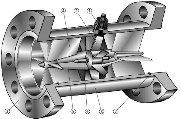 NuFlo turbine flowmeters indicate flow rate and measure total throughput of a liquid line. As liquid flows through the meter and over the rotor, the rotor turns at a speed that is directly proportional to the flow rate. A magnetic pickup senses the rotor blades as they pass and generates an electrical (sine wave) signal. These electrical pulses are then transmitted to the flow measurement readout equipment.