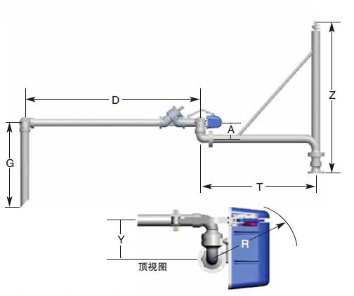 有許多懸臂結(jié)構(gòu)和配置方式可供選用,以適應(yīng)各種安裝要求。用于公路和鐵路槽車通過穹頂開口灌裝時,支撐式懸臂型灌裝臂可改裝用于密閉系統(tǒng)的