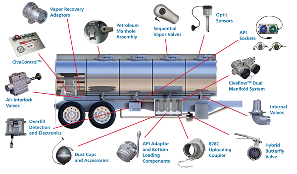 For more than 50 years, when it comes to the safe handling and transport of hazardous liquids, Civacon tank truck and transporting components and systems have been known the world over for their reliability, durability and superior performance. Our manhole assemblies, sequential vapor valves, overfill detection equipment, internal valves, loading and unloading components, as well as our trademark System 3 total tank truck systems are specified by all leading tank truck and transport builders around the world to ensure safety for personnel and the environment against petroleum and chemical spills, tank overfills and fugitive emissions. Our innovative, modular manifold and air control systems enhance fuel delivery profitability, accuracy and simplicity. Civacon sets the global standard for dependability, quality, compatibility, performance, and peace-of-mind.