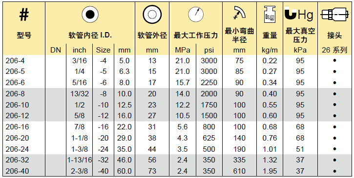 Parker 206系列空氣制動軟管產品選型表格