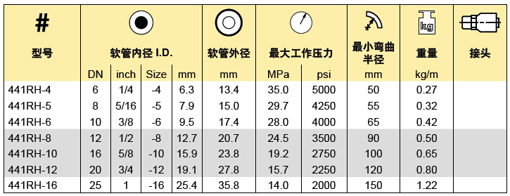 適用介質:石油基液壓油,水乙二醇,潤滑油,空氣和水。用于1.7MPa以上的空氣時,軟管需針刺。