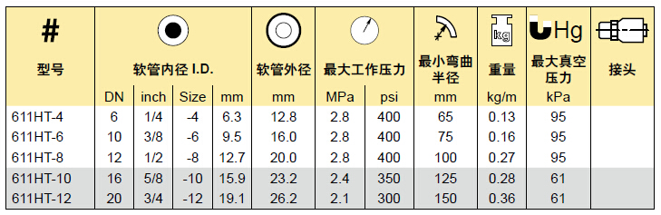 派克的 611HT 軟管是一種運輸軟管,工作壓力范圍為 300-400 PSI,專為高溫應用而設計。611HT 軟管的設計、制造和測試符合 SAE J517 100R6 / EN 854 R6 型規范。尺寸范圍從 1/4” 到 3/4” 直徑,以滿足各種市場的要求。Parker's 611HT hose is a transportation hose that has a working pressure range of 300-400 PSI which is designed for high temperature applications. 最低工作溫度: -55°F,-48°C 最高工作溫度: 302°F,150°C。