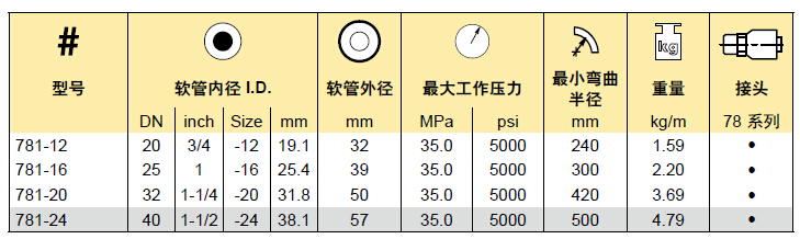 Parker 781恒壓軟管產品選型表格