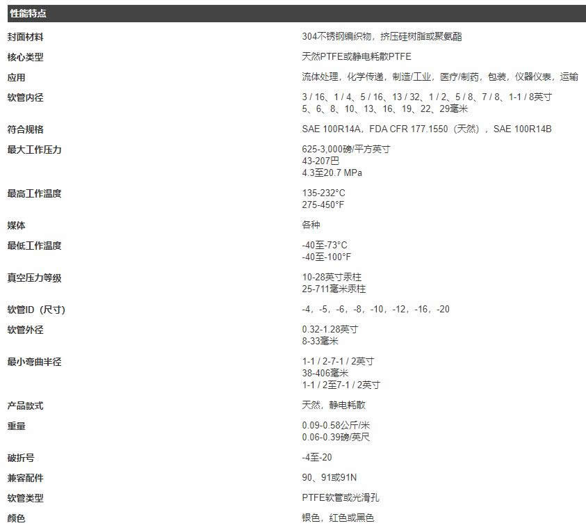 內(nèi)管:919 –符合FDA的天然PTFE增強(qiáng)材料:304不銹鋼編織層蓋:聚氨酯
