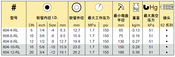 注: 訂貨號804-**-RL,**是軟管的通徑,RL指只接受整卷訂購。