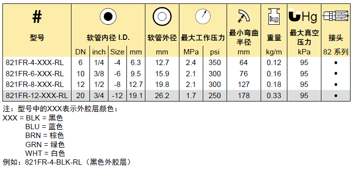 | 821FR產品型號 | 內徑mm |